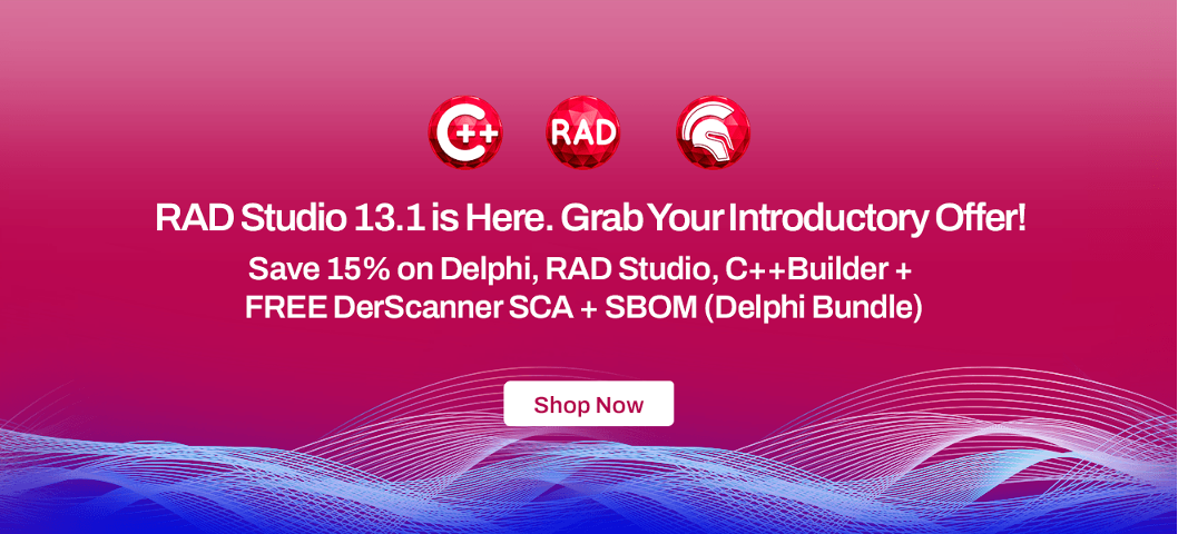 19 Mart – 31 Mart tarihleri arasında; RAD Studio 13.1, Delphi 13.1 ve C++Builder 13.1’in Professional, Enterprise veya Architect sürümlerinde %15 İNDİRİM fırsatından yararlanın. Ayrıca Delphi Enterprise & Architect sürümlerine özel DerScanner SBOM teklifini kaçırmayın.