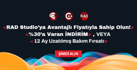 RAD Studio’nun yeni sürümü, her sene olduğu gibi yeni lisans alımlarında geçerli “Lansman İndirimi” ile geliyor. Geliştirme aracınızdan elde ettiğiniz değeri daha da artırmak için büyük promosyonlu fiyatları ve bonus araçları sakın kaçırmayın.